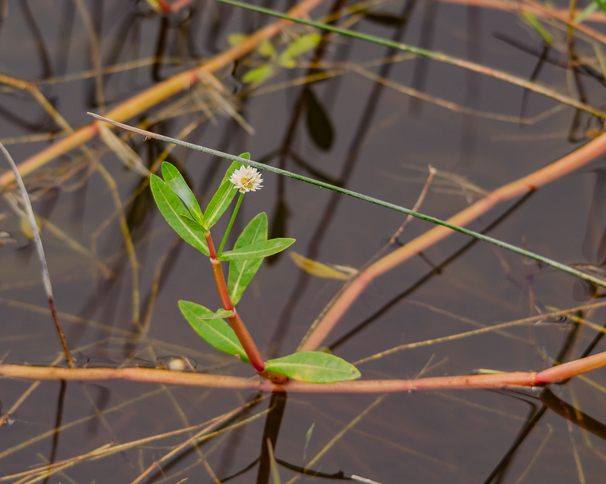 Alligator weed is non-native to North America and should not be spread. It is an obligate wetland plant that can be found in waste places in ponds, streams, and along some rivers.